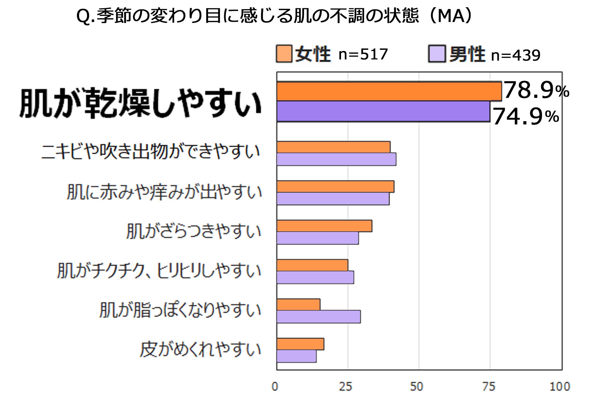 ■「季節の変わり目」の不調:「肌が乾燥しやすい」は男女共通で7割超
