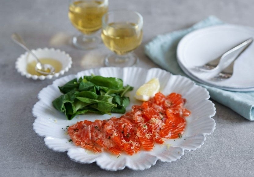 ④ 器に①のルッコラ、③のサーモンを並べ、塩と②のディルをふる。