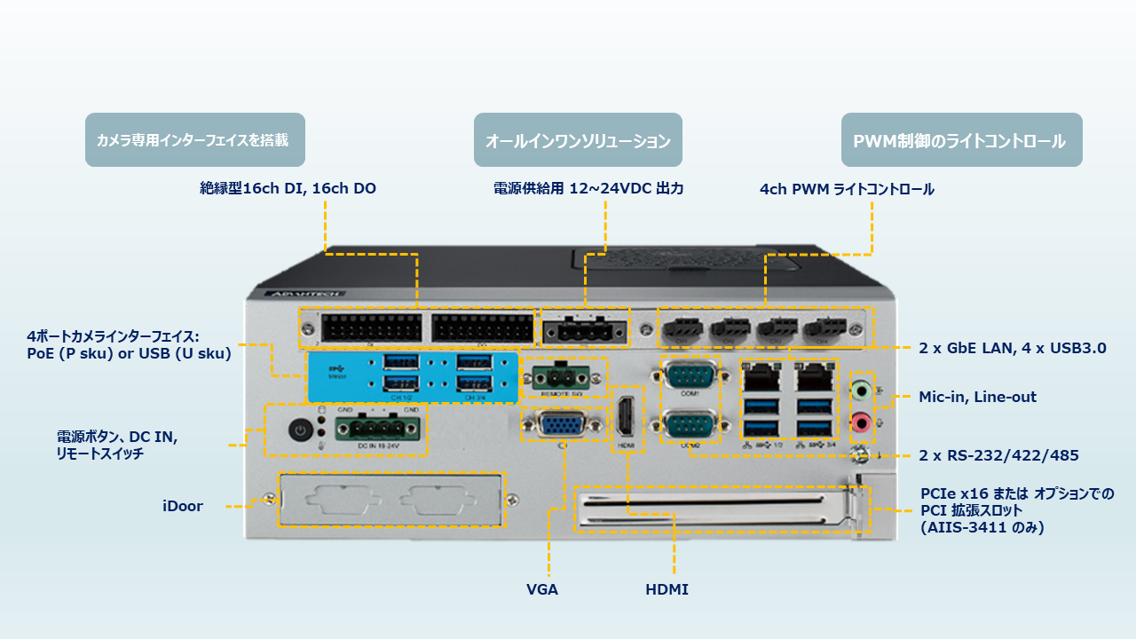 AIISシリーズは、検査カメラ用にPoE又はUSB3.0ポートを備え、画像検査アプリケーションに非常にご好評をいただいている製品です。その最新モデルであるAIIS-3411は、Intel®第10世代Core™iシリーズCPUに対応し、より高性能化を実現しました。大きさはA4用紙に収まるコンパクトサイズで、DINレールでの取付も可能なため制御盤への取付にも対応します。更に、オプションモジュール(AIIS-1882)の取り付けによって、PWMライトコントロールや、絶縁型DIOを増設する事も可能です。
