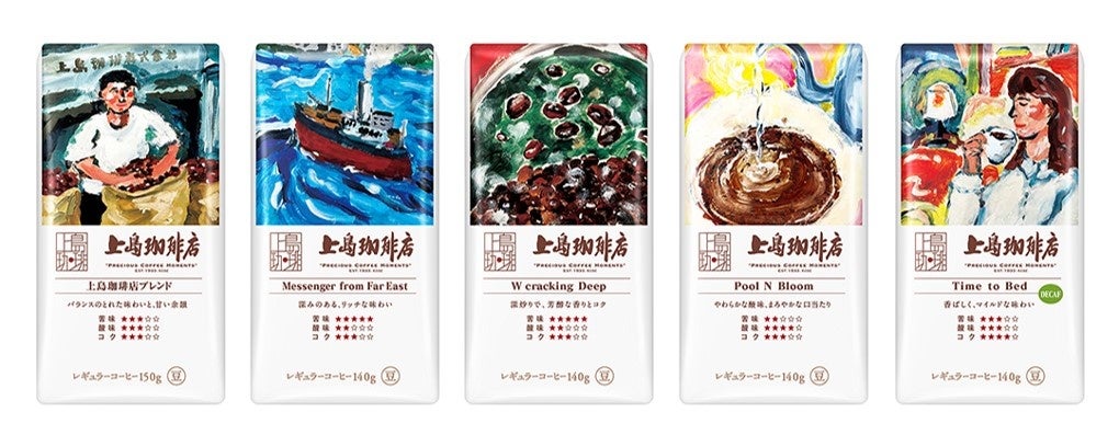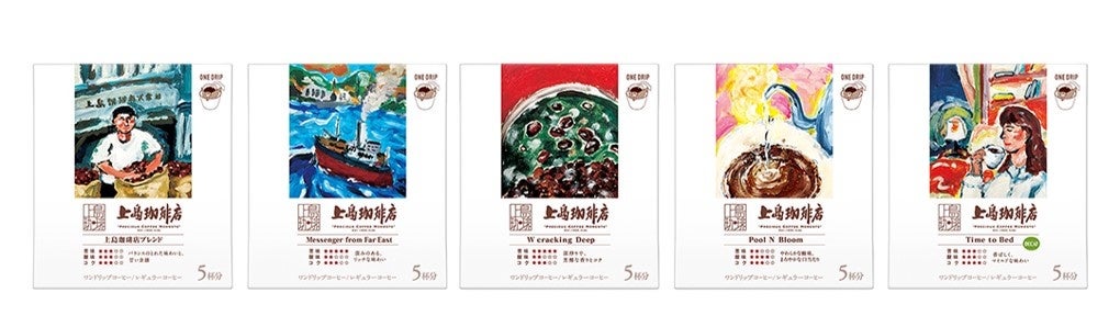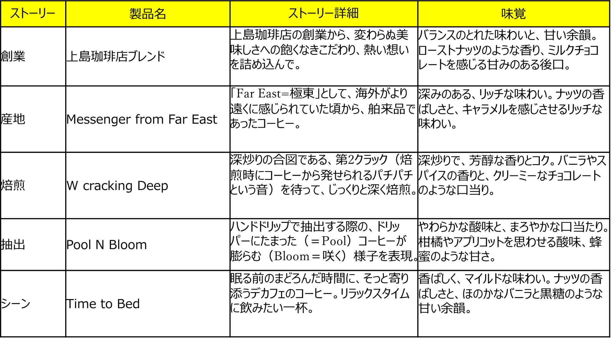 こうした消費者動向を背景に、この度、大人のための上質なコーヒー専門店『上島珈琲店』の味わいをご家庭でお楽しみいただけるブランドを立ち上げました。飲用シーンや持っている器具を問わず、どなたでも本格的なコーヒーを手に取りやすいよう、「創業」「産地」「焙煎」「抽出」「シーン」の5つの“ストーリー”を楽しめる5種類のブレンドを豆、ワンドリップ、粉の3カテゴリーで製品化し、3月7日(月)より、全国のスーパーなど小売店やECで発売しました。『上島珈琲店』の店舗やEC以外で、『上島珈琲店』ブランドのレギュラーコーヒー製品を展開するのは初めてです。