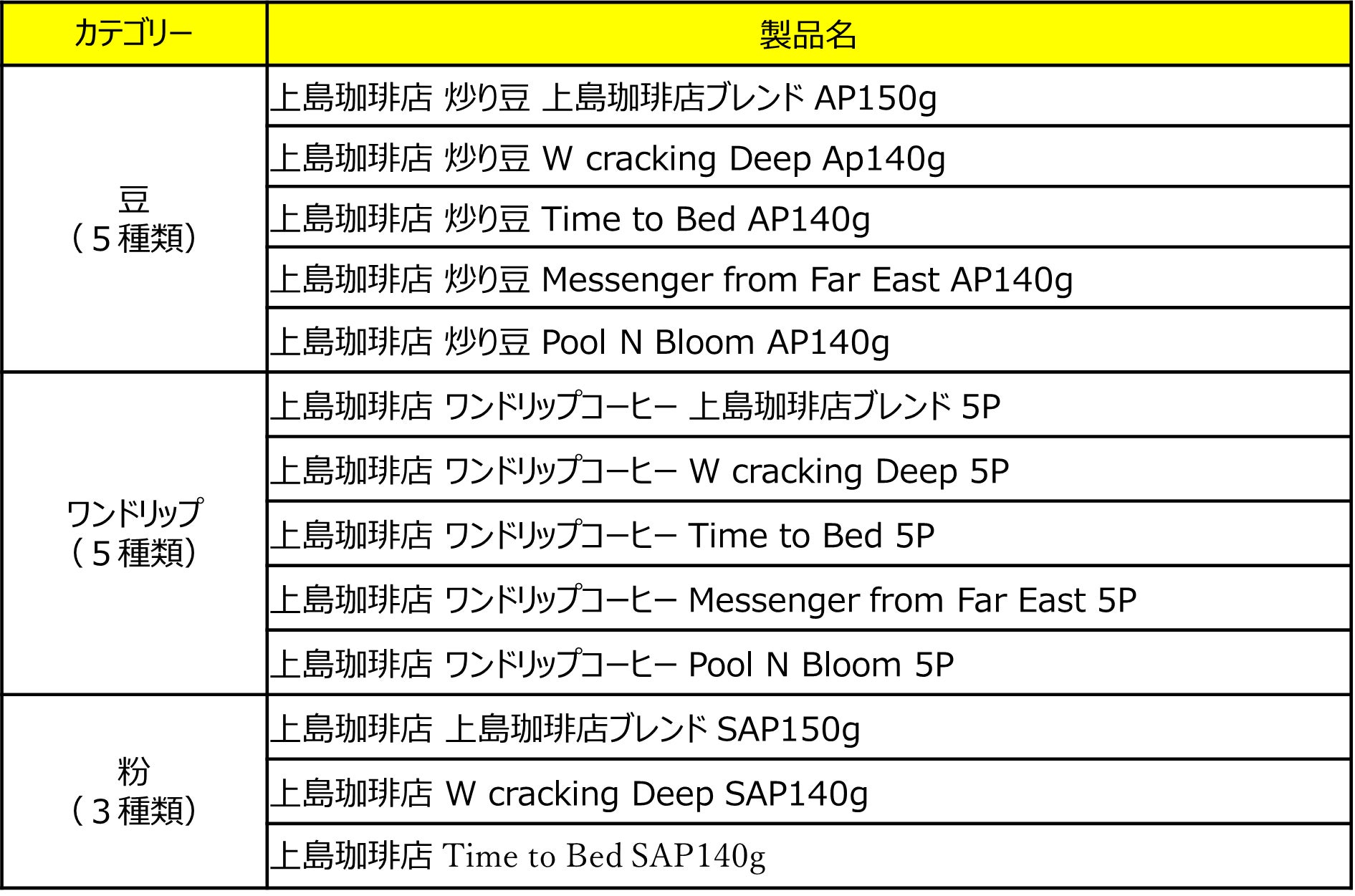 ・対象製品:上島珈琲店 家庭用製品全品(炒り豆 5品/ワンドリップ 5品/粉 3品)