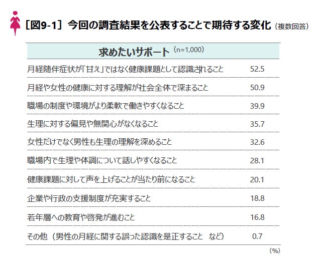 最後に、今回の調査結果を社会に発信することで期待される変化を聞きました。すると、「月経随伴症状が『甘え』ではなく健康課題として認識されること」(52.5%)、「月経や女性の健康に対する理解が社会全体で深まること」(50.9%)が多く挙げられました。加えて、職場での制度・環境改善や、男性を含む社会全体の理解促進を望む声も多く、月経に関する課題は個々の問題にとどまらず、社会全体で取り組むべきテーマであることがうかがえます[図9-1]。