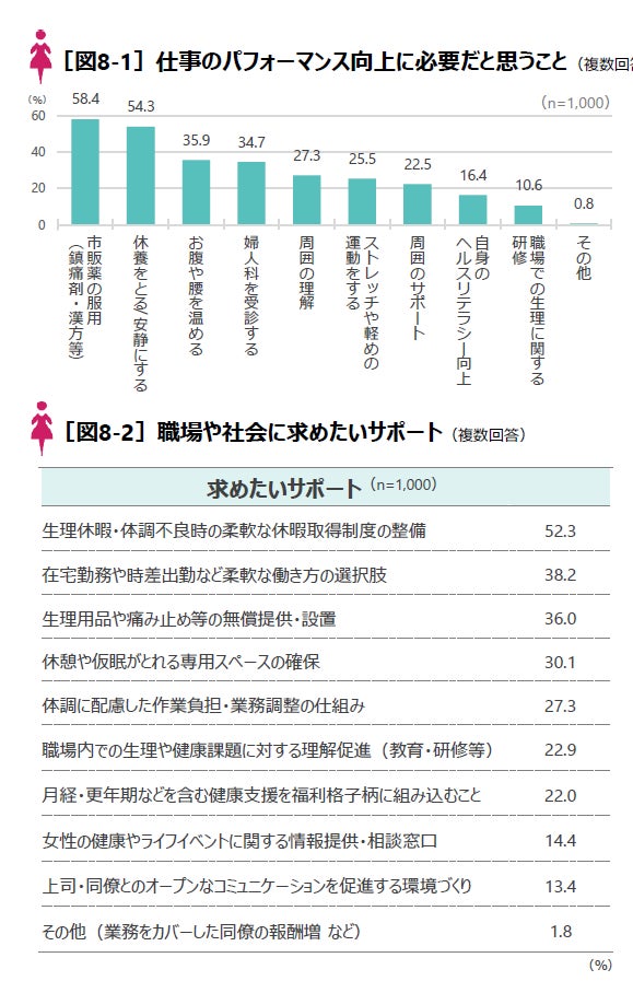 調査対象者全体では、パフォーマンス向上のために「市販薬の服用」「休養・安静」などのセルフケアや「婦人科受診」に加え、「周囲の理解」「職場のサポート」といった環境改善を求める声もあった。