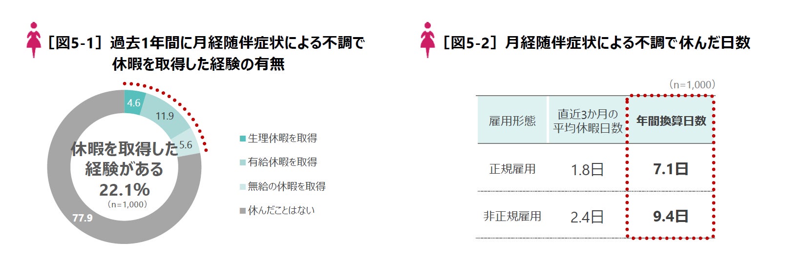 月経による不調で休暇を取得した人は「有給休暇」(11.9%)、「無給の休暇」(5.6%)、「生理休暇」(4.6%)と、全体で22.1%にとどまりました[図5-1]。直近3か月間以内に月経随伴症状による不調で仕事を休んだ日数をもとに、年間の日数を算出したところ、正規雇用は平均7.1日、非正規雇用では平均9.4日という結果となりました[図5-2]。