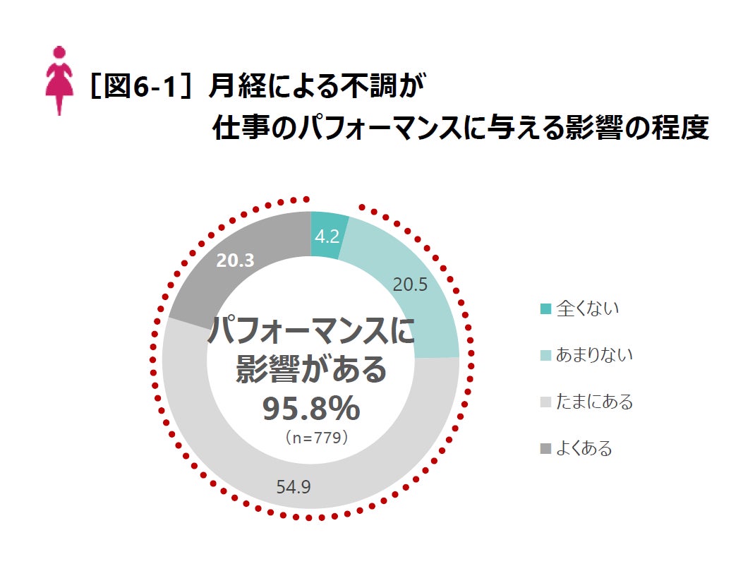 月経による不調で休暇を取得した女性は22.1%にとどまり、休暇を取らなかった女性のうち95.8%が仕事のパフォーマンスに影響があると回答しています。月経時には平均で約4割のパフォーマンス低下が認められ、女性は普段の6割程度の能力しか発揮できていないのが現状です。この影響は、離職経験者6.4%の背景にもつながっていると考えられます。パフォーマンス向上のためには「周囲の理解」や「職場のサポート」が不可欠との声が挙がっており、企業による柔軟な休暇制度や在宅勤務制度の推進が求められます。さらに、女性の健康に関して社会全体で月経に関する正しい知識が浸透する仕組みを構築し、女性がセルフケアと職場環境の改善を通じて活躍できる基盤を整えることが重要です。