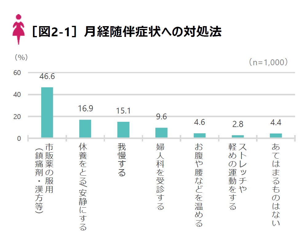 主な対処方法は「市販薬の服用」(46.6%)、「休養・安静」(16.9%)、「我慢」(15.1%)などで、「婦人科受診」は9.6%。