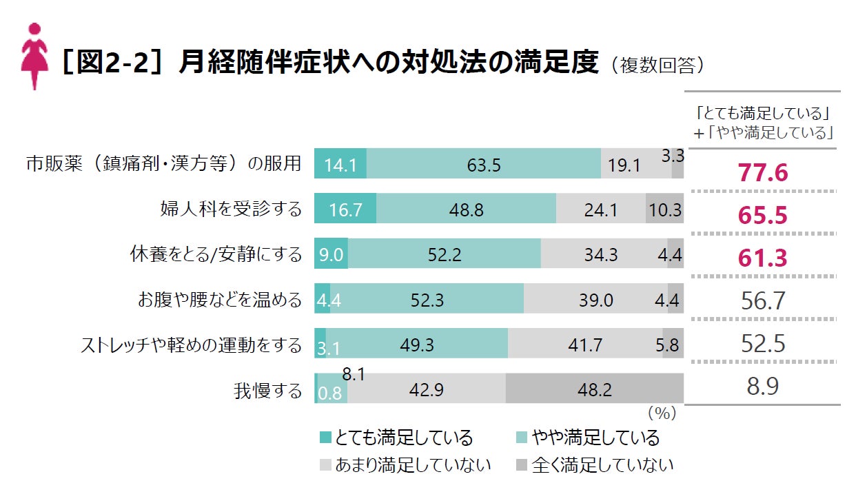 また、対処法別の満足度では「市販薬(鎮痛剤・漢方など)の服用」(77.6%)、「婦人科を受診する」(65.5%)、「休養をとる/安静にする」(61.3%)が高い結果となりました。産婦人科受診の満足度は高いものの、多くの人が市販薬や休養などの身近な方法で対応しており、症状の背景にある病気に気づかないまま過ごしている可能性も考えられます[図2-2]。