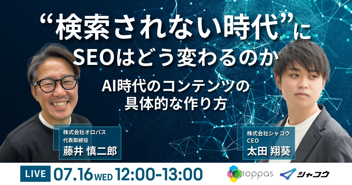 SEOツール「パスカル」の開発・提供を行う株式会社オロパスは、2025年7月16日(水)に「 “検索されない時代”にSEOはどう変わるのか〜AI時代のコンテンツの具体的な作り方〜」をテーマに株式会社シャコウと共催ウェビナーを開催いたします。
