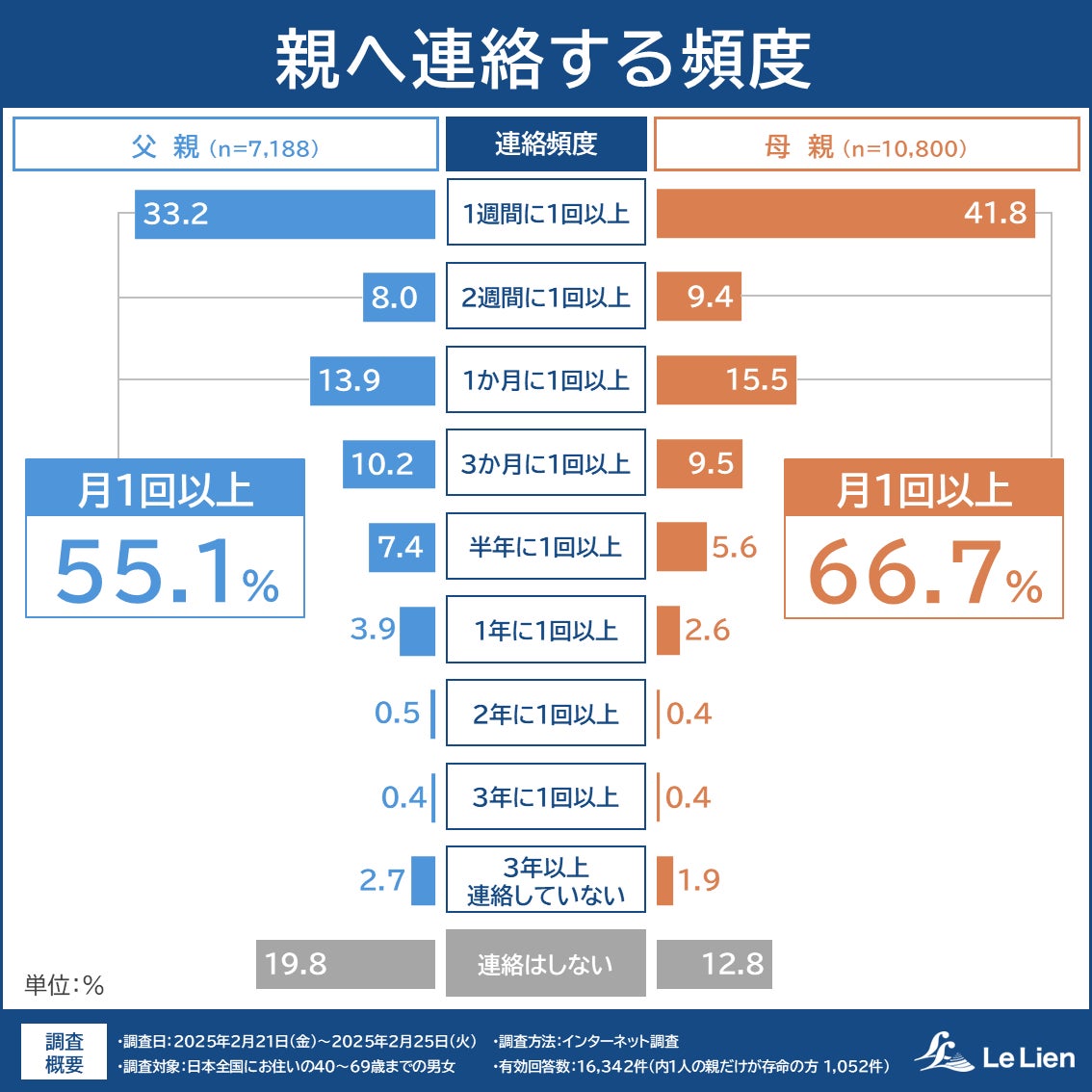 【相続・終活に関する全国調査2025 結果発表第3弾】母への連絡 父より頻繁 月1回以上の連絡割合に大きな差