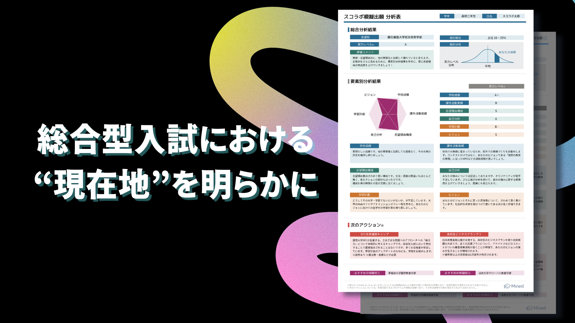 スコラボ模擬出願は、総合型入試における現時点のあなたの相対的な実力と、次にやるべきことを明らかにするプログラムです。