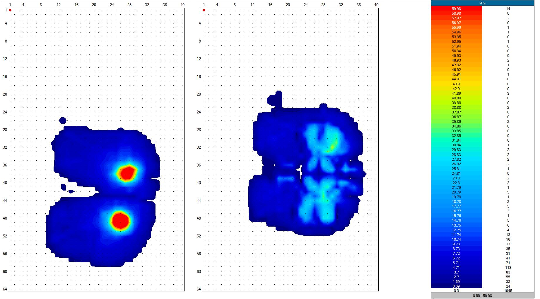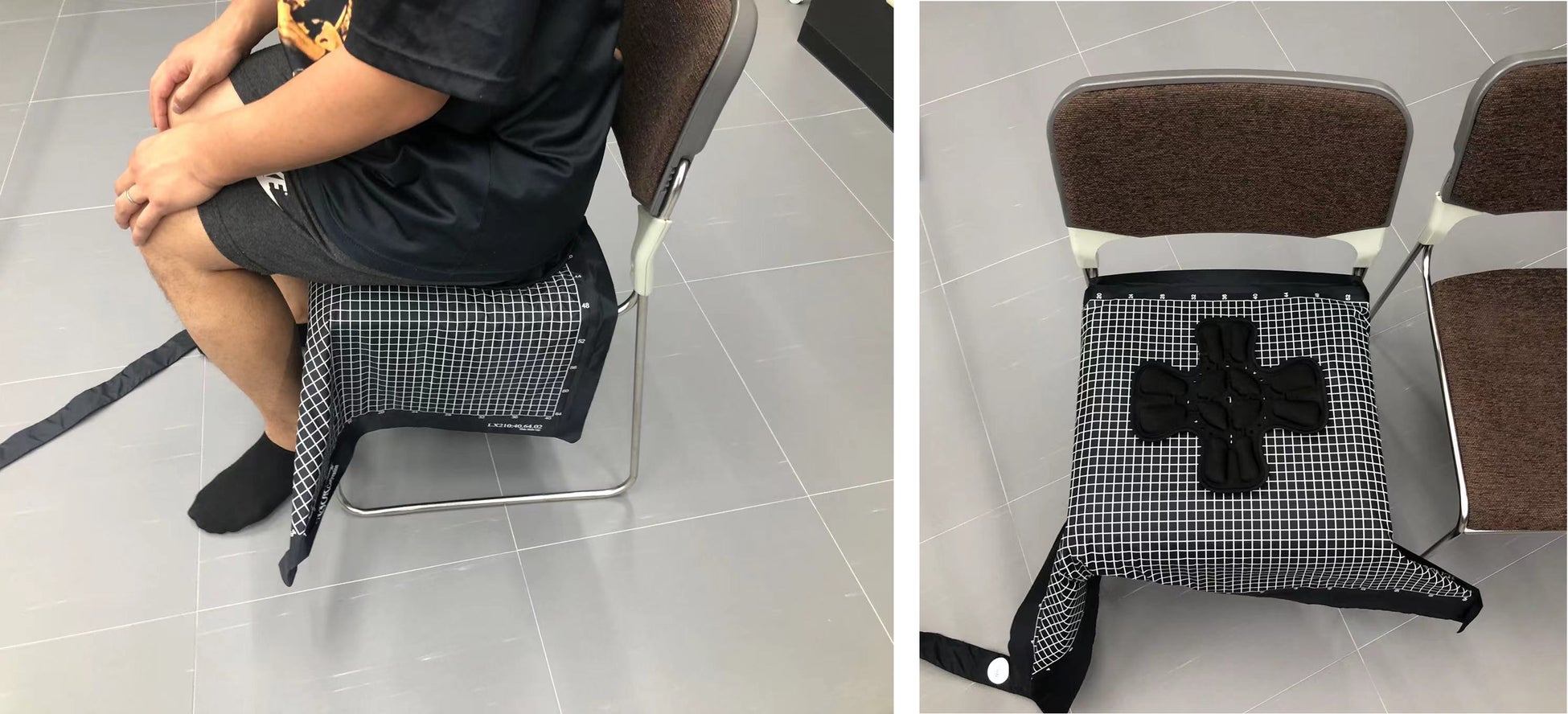 普通に座った場合のピーク圧⼒(90.29kpa)に対し、immersepadheadの上に座るとピーク圧⼒(39.39kPa)が56%減圧しました。