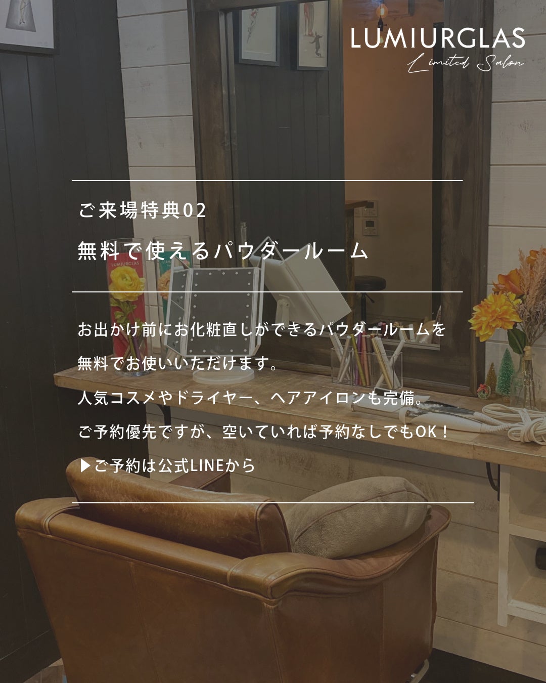 お出かけ前にお化粧直しができるパウダールームを無料お使いいただけます。人気コスメやドライヤー、ヘアアイロンも完備。ご予約優先となりますが、座席に空きがある場合は予約なしでご利用いただけます。