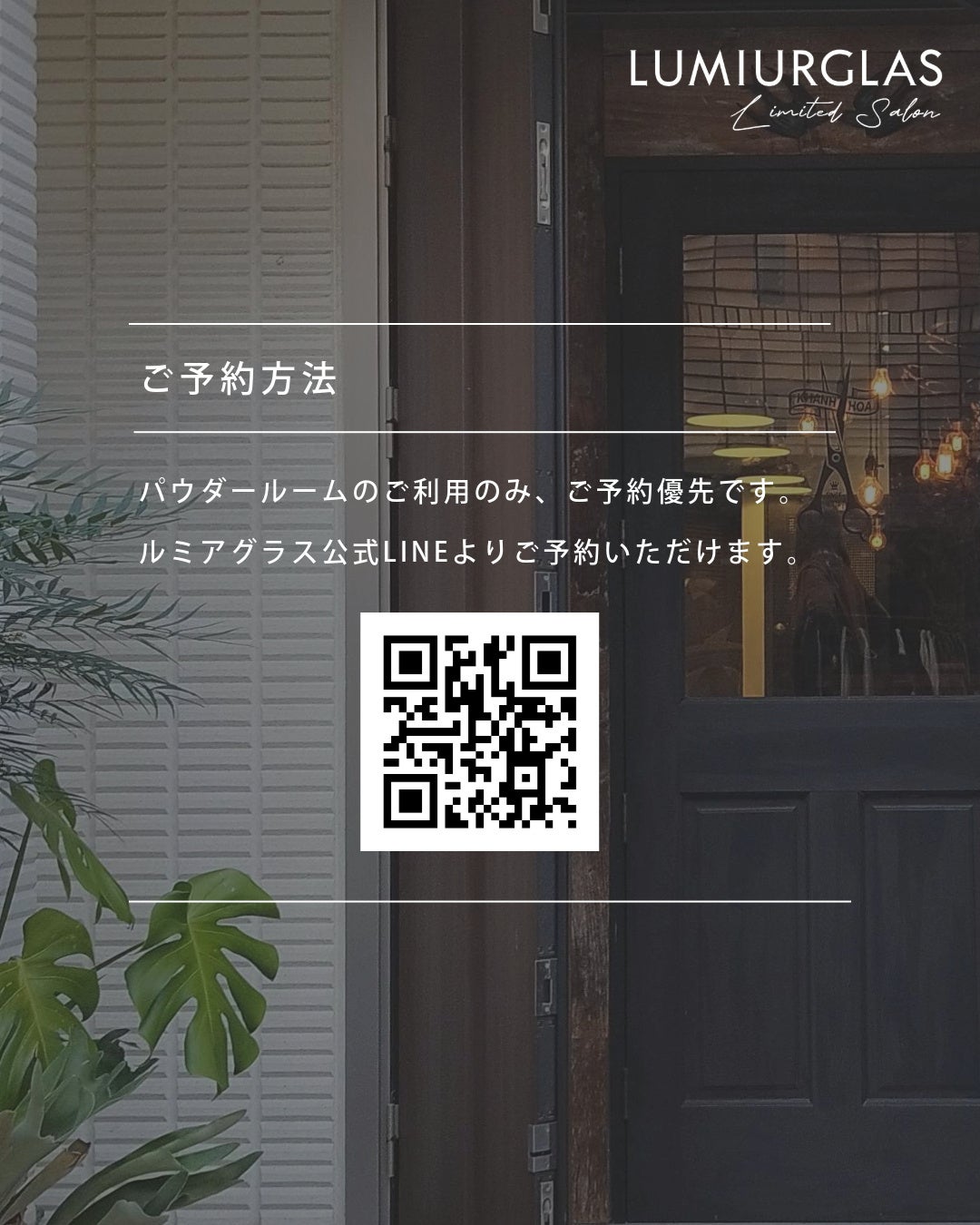 パウダールームご利用希望のお客様は、事前予約を承っております。ご予約の際はQRコードよりルミアグラス公式LINEにてご予約いただけます。