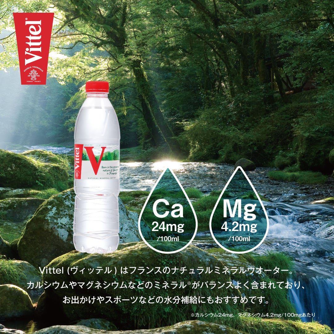 Vittelは、フランスの北東部のドイツとの国境に近いヴォージュ山脈の麓にある水の町「ヴィッテル」で採水されたナチュラルミネラルウォーター。カルシウムやマグネシウムなどのミネラル*がバランスよく含まれている硬水にもかかわらず、際立ったクセがなく飲みやすいのが特徴。お出かけやスポーツなどの水分補給にもおすすめです。