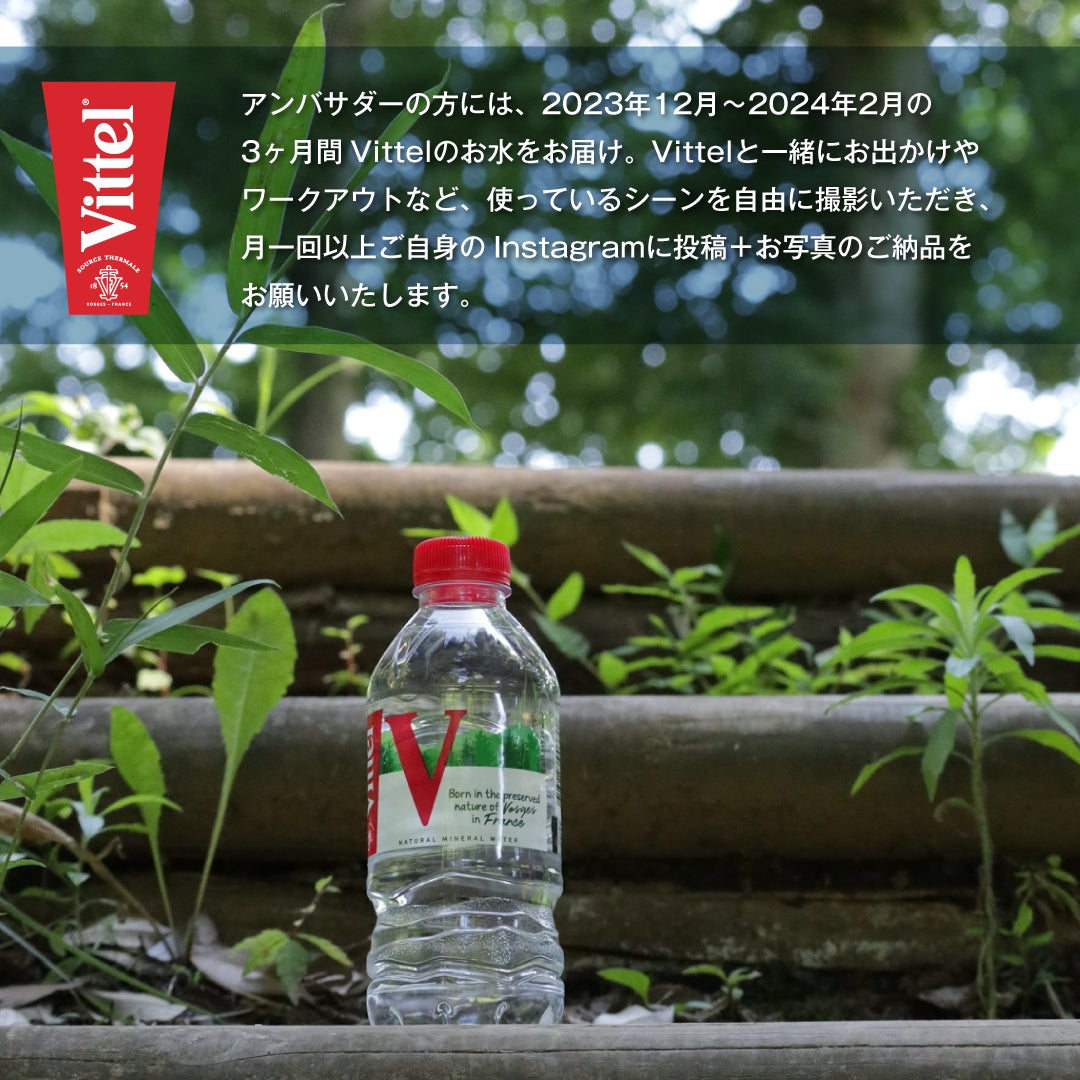 アンバサダー当選の10名様には2023年12月~2024年2月の3カ月間、Vittelのミネラルウォーターを毎月お届けします。Vittelの魅力を積極的に発信してくださる方のご応募をお待ちしております。
