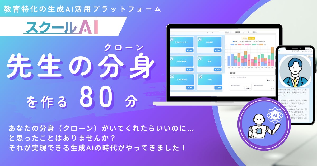 みんがくは、Microsoft社のAzure OpenAIを基盤とした、教育現場でChatGPTなど生成AIを安心して利用するためのプラットフォーム「スクールAI」を使って先生自身の分身(クローン)を作るワークショップを行います。
