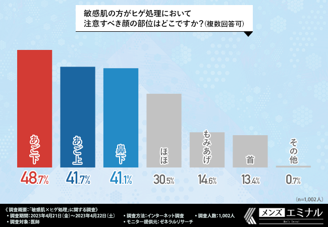 「敏感肌の方がヒゲ処理において注意すべき顔の部位はどこですか?(複数回答可)」と質問したところ、『あご下(48.7%)』と回答した方が最も多く、次いで『あご上(41.7%)』『鼻下(41.1%)』『ほほ(30.5%)』『もみあげ(14.6%)』と続きました。