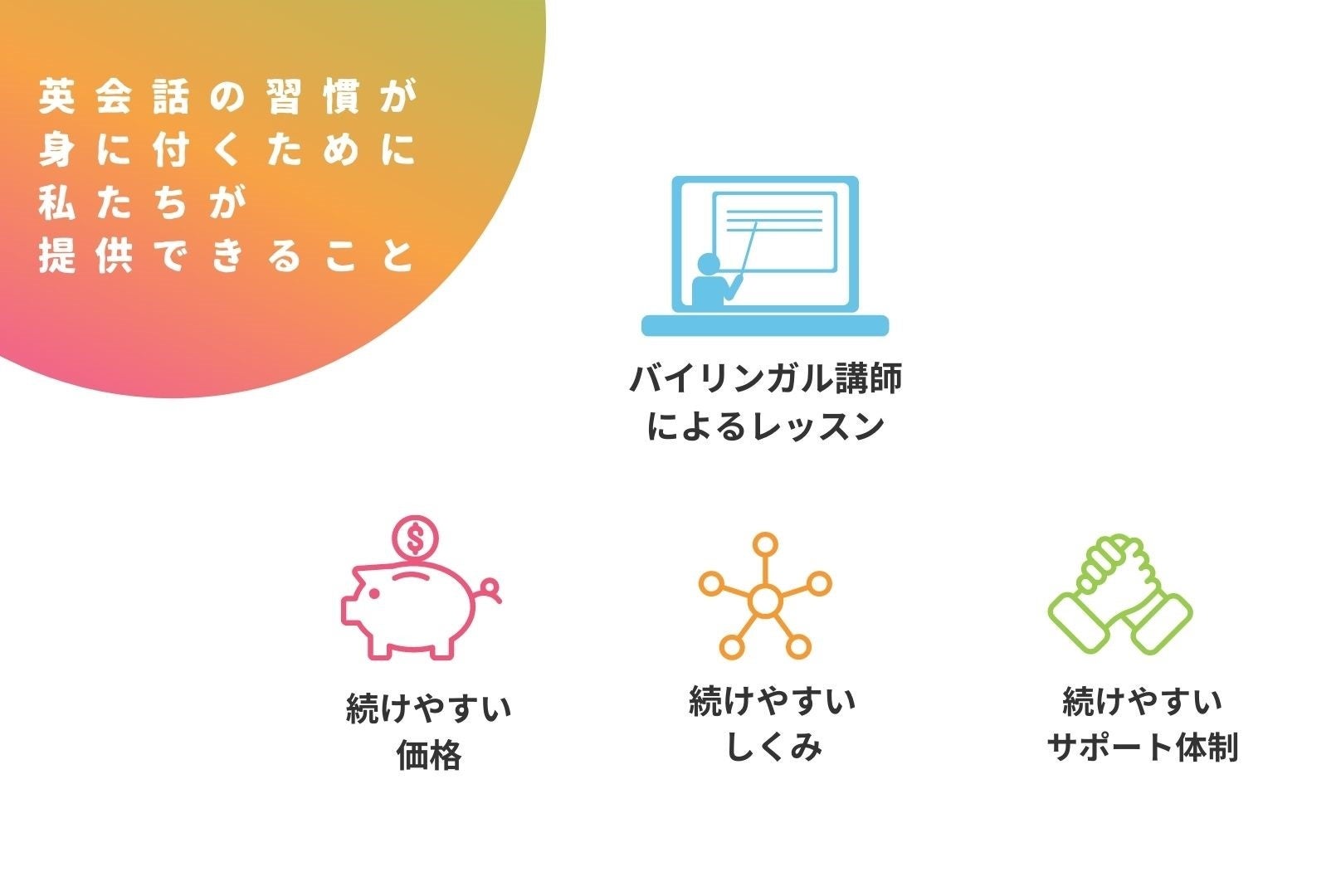 「楽しく聞いて、楽しく話す!」に軸を置き、毎日の暮らしの中で「家族みんなでつくる英会話習慣」をGOALに置いています。英会話を楽しく自然に生活に取り入れる機会とノウハウをご提供する、親子向けオンライン英会話スクールです。