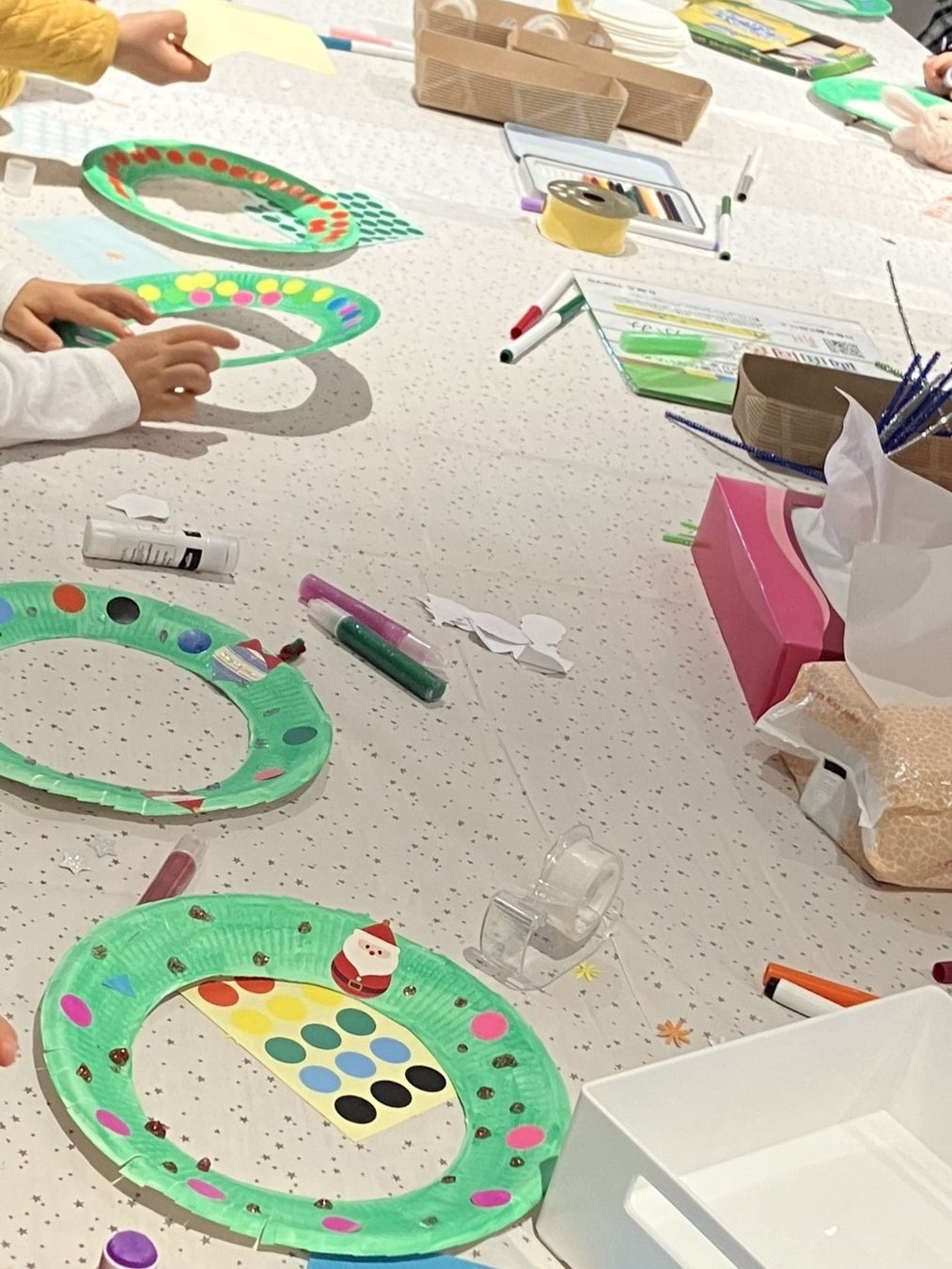 クリスマスクラフトでは、子どもたちみんなで紙皿を使ったクリスマスリースを作りました。それぞれ好きなシールでデコレーションし、個性豊かなリースができました。