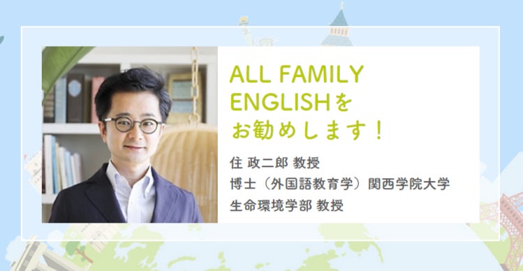 関西学院大学生命環境学部の住 政二郎(博士・外国語教育学)教授にはレッスンがより効果的で楽しいものとなるようALL FAMILY ENGLISHのカリキュラム監修に入っていただいています。