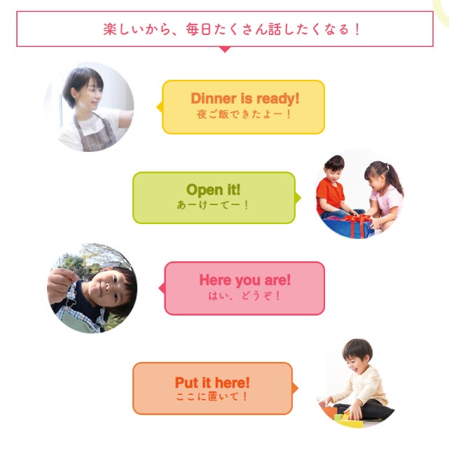 ALL FAMILY ENGLISHでは、いかに英語を自分の言葉にできるかに着目し、すぐに家族で使えるフレーズを指導しています。家族で使えるフレーズ学習は学校で習う形式的なフレーズ学習よりも実用的である為、お子様に英会話が定着しやすいです。また最も信頼できる家族と一緒に英会話を楽しむことで更に学びを深め楽しく継続することができます。