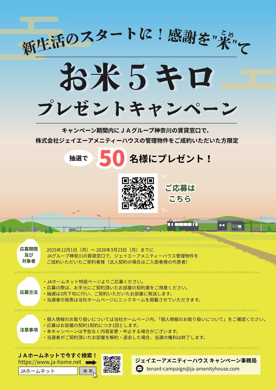 神奈川県を中心に約2万2,000戸の賃貸アパート・マンションの管理および、JAパーキングネットの運営を手がけ、入居率98.5%(※2025年10月末現在)を維持する株式会社ジェイエーアメニティーハウス(本社:神奈川県平塚市、代表取締役社長:小野 忠久)は、2020年から実施している「国産農畜産物応援プロジェクト」の一環として、『新生活のスタートに!感謝を“米”て お米5kgプレゼント!キャンペーン』 を今年度も実施いたします。
