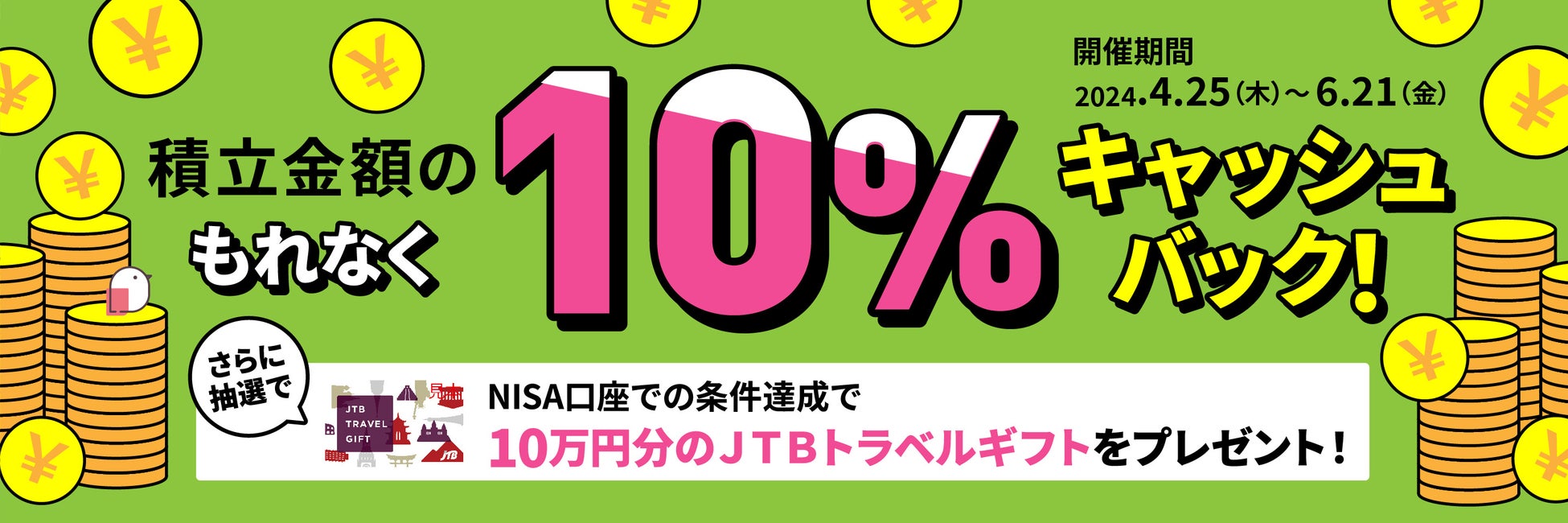 さらに、NISA口座で10,000円以上積立された方の中から抽選で10名様に10万円分のJTBトラベルギフトをプレゼント!