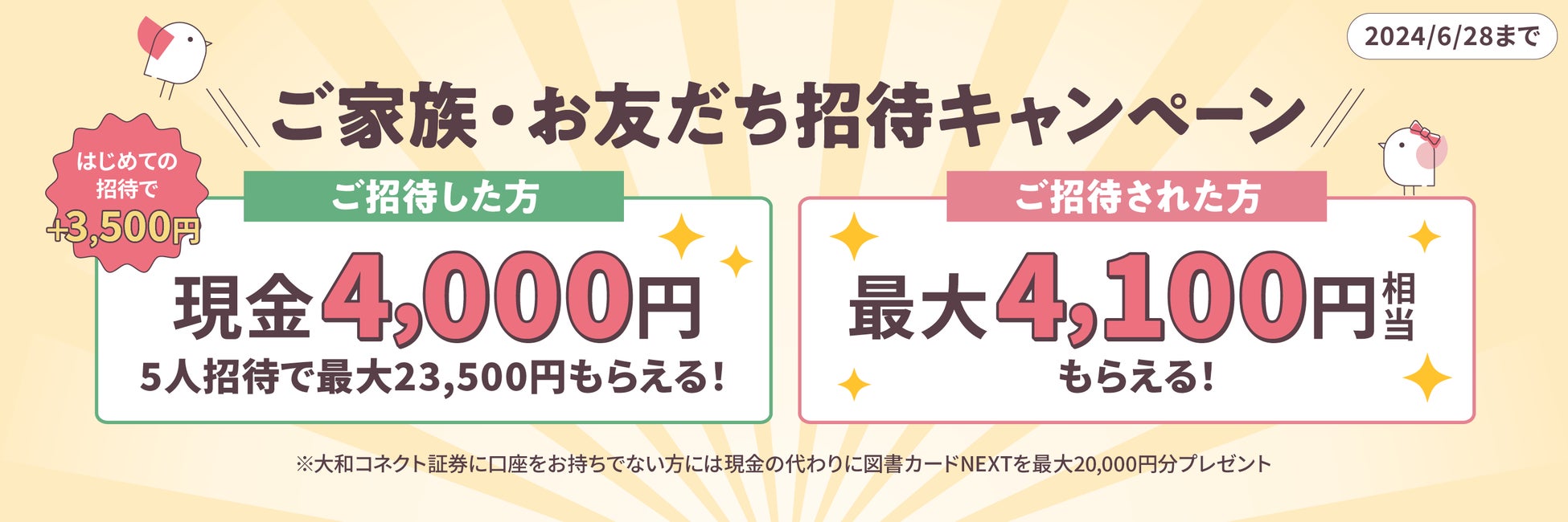 これから資産運用を検討されるご家族・お友だちを大和コネクト証券に招待していただき、その方に新規口座開設および初回ログイン※1をしていただくと、ご招待者様に、1人招待するごとに現金4,000円、最大20,000円(5人招待)プレゼント!!