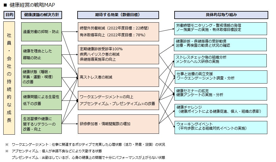 健康診断の受診状況、健康に関するアンケート等より、社員の健康課題を把握し、優先的に取り組む課題を決め、実施計画(健康経営の戦略MAP)を策定します。