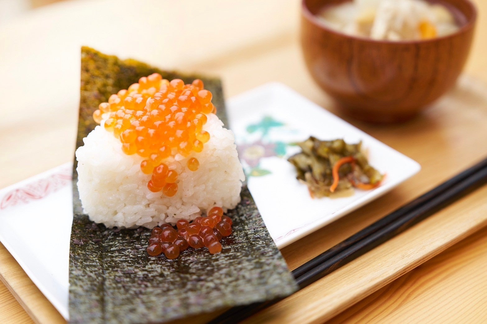 当店自慢の青森県産青天の霹靂、三重県の香り高い海苔、伯方の天然塩をつかってふっくらにぎったおむすびに「シラリカいくら」をたっぷりかけてご提供します。