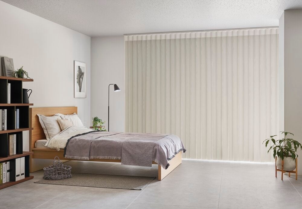 採光時にはU字状にウェーブした生地がカーテンのような柔らかさと立体感 を演出し、全閉時はファブリックの質感を残しながらも、タテ型ブラインド特有のスッキリとした姿に変わる、いいとこどりをした窓まわりのインテリアとして、リビングにも、寝室にも合うデザインが魅力です。さらに、生地をバトンで回転させるだけで採光状態と全閉状態を作り出すことができるため、カーテンのように開け閉めをする手間が省けることから、機能面においても非常に優れています。