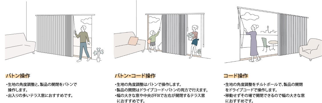 シーンに合わせて選べる操作方法は、簡単な操作で安全性の高い「バトン操作」、操作性の高い「バトン・コード操作」・大開口の窓に便利な「コード操作」の3種類があります。
