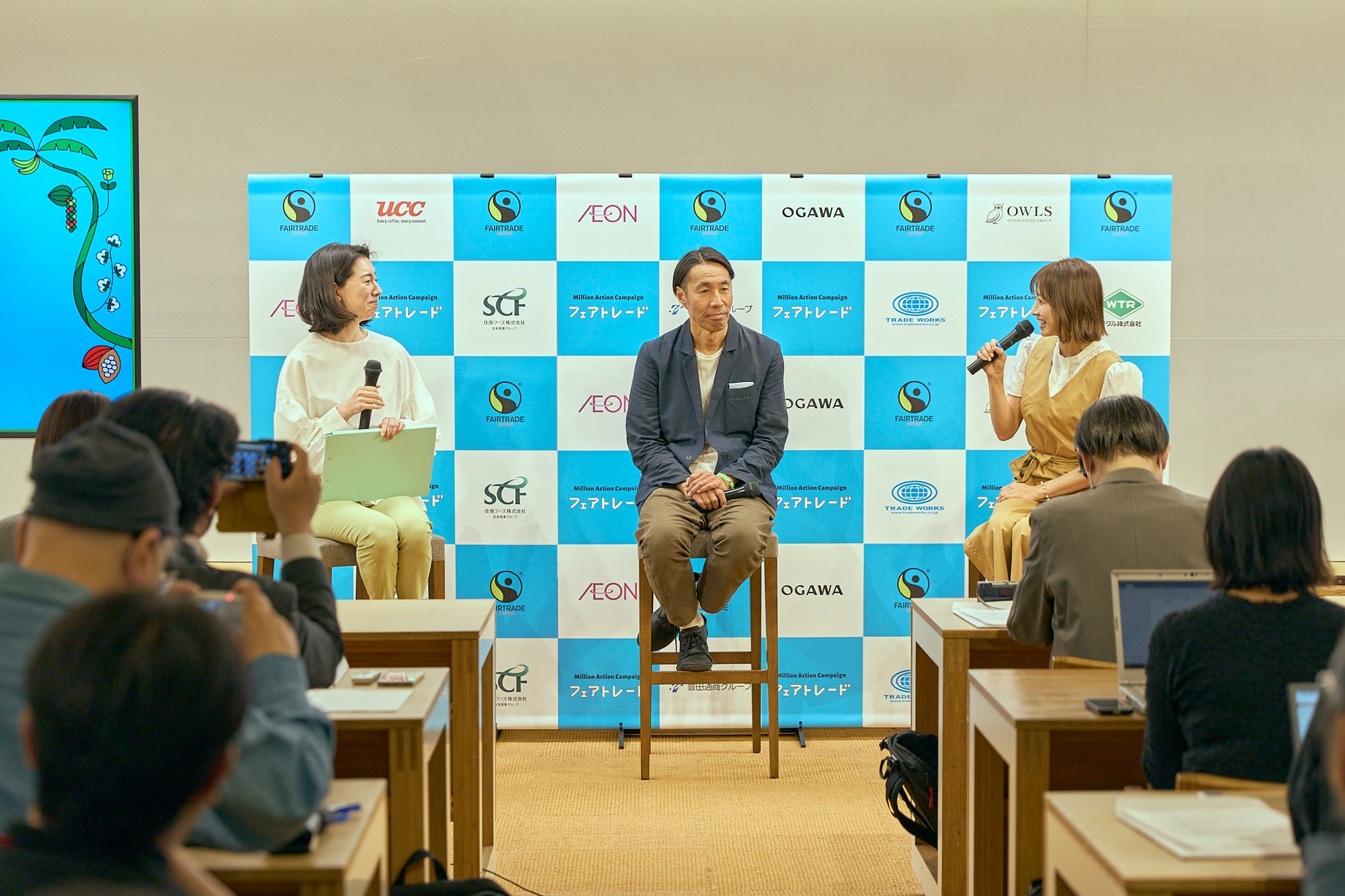 記者会見パートの最後では、Jリーグ執行役員(サステナビリティ担当)の辻井隆行さんと株式会社セント・フォース取締役の望月理恵さんをゲストにお招きし、”なくなってほしくない未来”などをテーマにトークセッションを実施。フェアトレードに関するアクションを起こすことで、気候変動の対策となり、大事なものを守ることにつながることなどを踏まえ、ミリオンキャンペーンにエールを送りました。