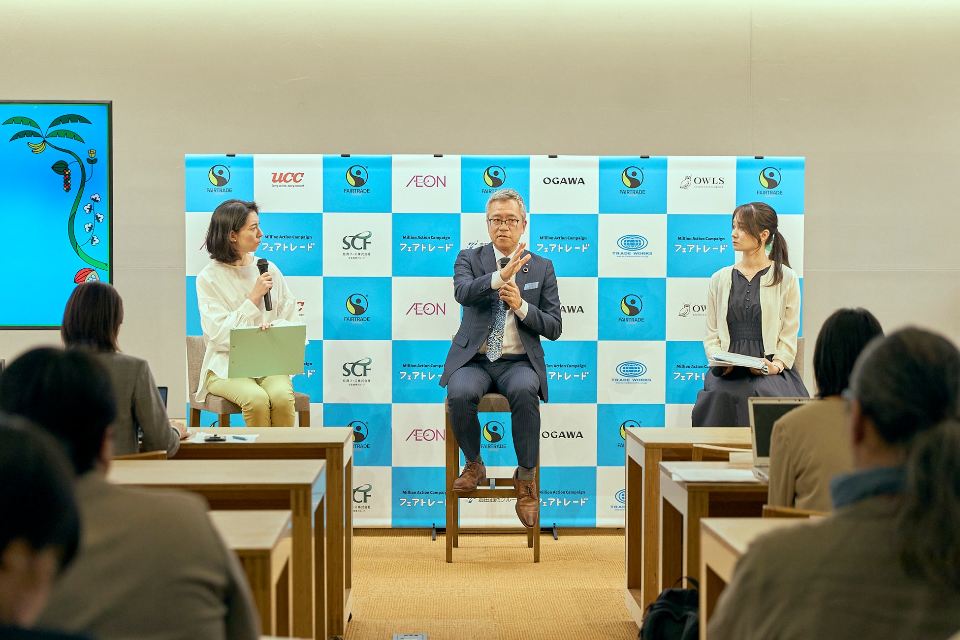 ミリオンアクションキャンペーン開催に先立ち、5月1日にキックオフイベントを開催しました。当日は、最新のフェアトレード市場規模の発表や認証企業でありキャンペーンのパートナー企業でもあるイオン株式会社や小川珈琲株式会社による取り組みについて紹介がありました。またJリーグ執行役員(サステナビリティ担当)である辻井隆行さんと株式会社セント・フォース取締役の望月理恵さんをゲストにお招きしトークセッションを実施。会見後には、企業担当向けの有識者セミナーとして書籍・売れる「値上げ」著者の深井賢一氏を招き「ソーシャルプロダクトの販売戦略〜インフレ下にも共感を生む仕掛け〜」をテーマにした企業向けセミナーのほか、自治体や市民と一緒に製品開発を行う三本珈琲株式会社や食品大手の国分グループ本社株式会社からも最新の取り組みを紹介しました。会場には約130名の企業担当者や学生等の参加者が集まり、キャンペーン開催を盛り上げました。