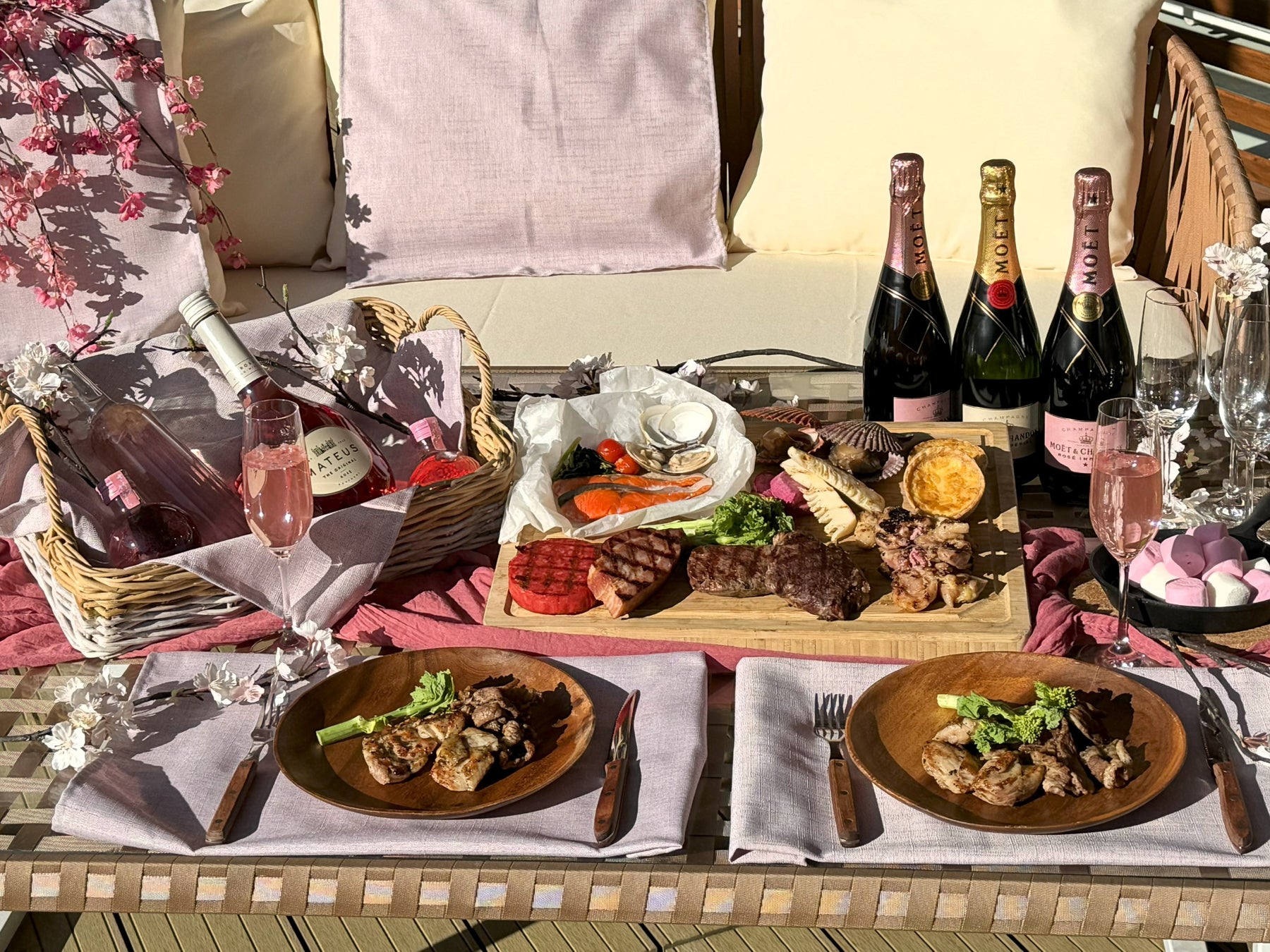 桜の魅力を凝縮した、春の訪れをおいしさで感じる特別メニューは、桜マスの紙包み焼き、桜花塩漬けの鶏もも肉、桜海老のキッシュ、そしてほんのり甘くてふんわりの桜色のマシュマロなど、春ならではの食材を使用したBBQメニューで贅沢なひとときをお楽しみいただけます。桜並木を眺めながら、華やかなさくら色に包まれたBBQで、春の訪れを心ゆくまで感じてください。