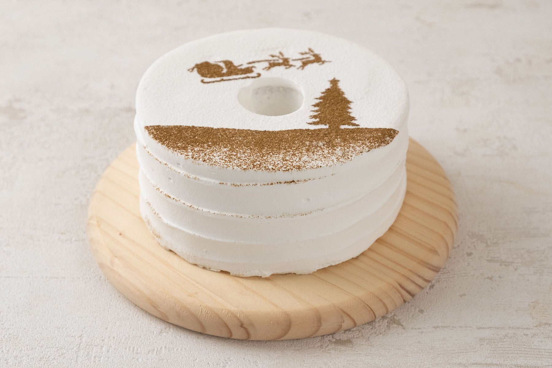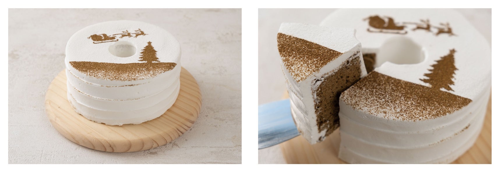 九州産生クリームと国産マスカルポーネを使用したコクのあるクリーミーなクリームでシフォンを包み込み、紅茶のパウダーでクリスマスの模様をつけました。
