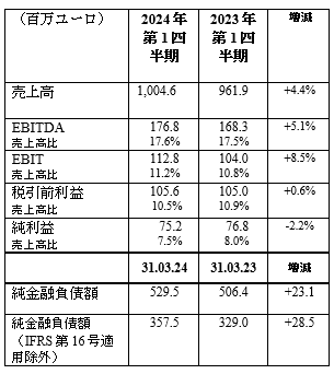 · 売上高 1,004.6百万ユーロ(4.4%増、前年同時期の為替レート基準で5.3%増)