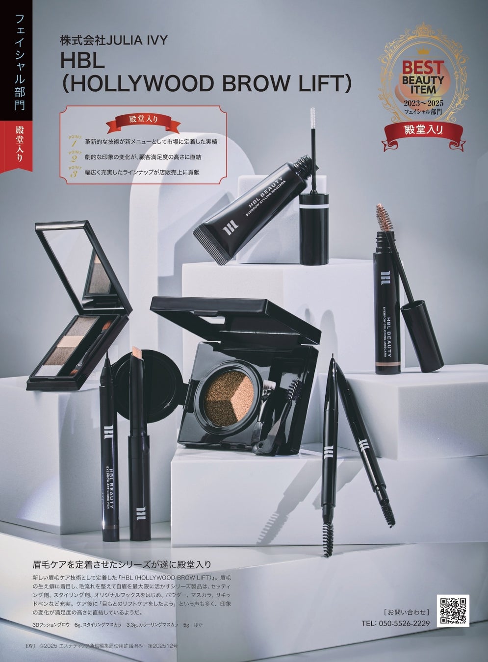 最先端のアイブロウソリューション®︎「HBL(ハリウッドブロウリフト)®︎(以下:HBL)」を提案する株式会社JULIA IVY(本社:東京都渋谷区、代表取締役社長:福井仁美、以下「当社」)は、株式会社美容経済新聞社が発行するサロン経営者向け専門情報誌「エステティック通信」のオリジナルアワードである『ベストアイテム2025』を3年連続受賞し、殿堂入りを果たしたことをお知らせいたします。