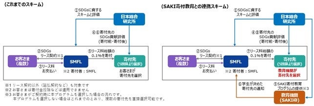SMFLは、2019年12月より「みらい2030®」の取り扱いを開始しました。SMFLの寄付先に対する評価を日本総研が行い、「みらい2030®」を通じて、寄付に賛同いただいたリース契約先からのリース料の一部をSDGs達成に資する公益財団法人またはNPO法人などに寄付しています。今般の取り組みは、リース契約先が、寄付先の選定を寄付教育を受ける学生に委託できるオプション(SAKI枠)を新たに設けるものです。SAKI枠では、学生向け寄付教育であるSAKI寄付教育プログラムの一環として、学生が寄付先の検討・選定を行います。なお、SAKI寄付教育プログラムは、日本総研から国内の教育機関に提供されます。