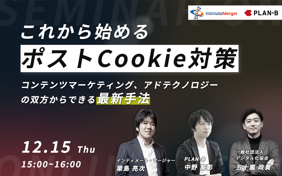 国内最大級パブリックDMPを提供するデータプラットフォームカンパニーの株式会社インティメート・マージャー(本社:東京都港区、代表取締役社長:簗島 亮次、以下当社)は、顧客のデジタルマーケティングをワンストップで支援する株式会社PLAN-B(東京都品川区、代表取締役:鳥居本真徳、以下PLAN-B)と共催セミナー「これから始めるポストCookie対策~コンテンツマーケティング、アドテクノロジーの双方からできる最新手法~」を12月15日(木)15時より実施することをお知らせします。