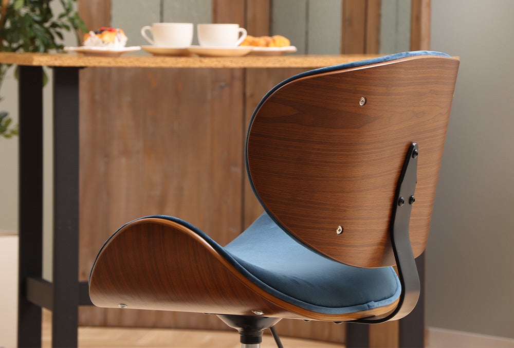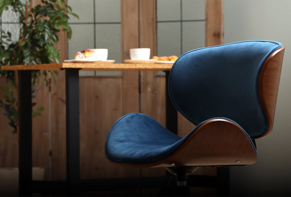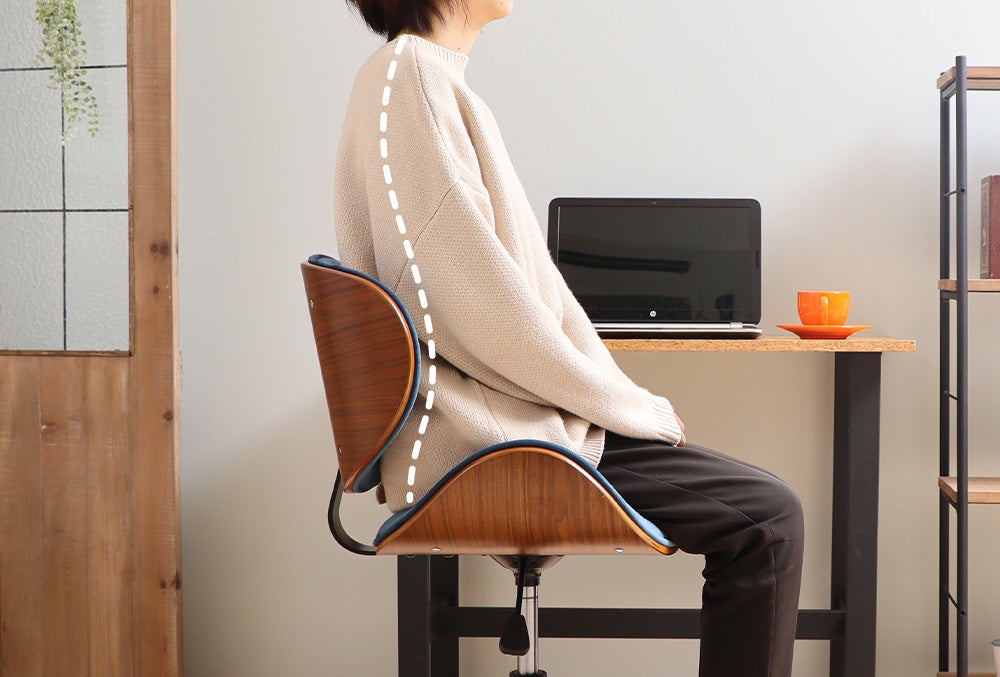 一般的なオフィスチェアと比較し、座面の奥行き寸法を短く設計しました。普通に座るだけで背もたれのカーブが背中にフィットし、背筋が自然に伸びます。姿勢が正しくなると、腰痛や肩こりが軽減されるので、長時間のデスクワークも快適に過ごせます。また、成型合板の曲線に合わせた弾力のあるウレタンシートにより、腰回りが包み込まれるような座り心地を実現しました。