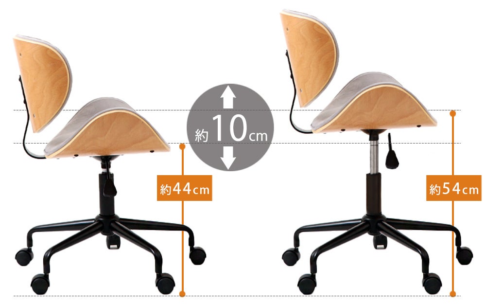 身長やデスクに合わせて約10cm昇降が出来るので、座面高は約44~54cmで調整が出来ます。様々な身長をカバーしています。