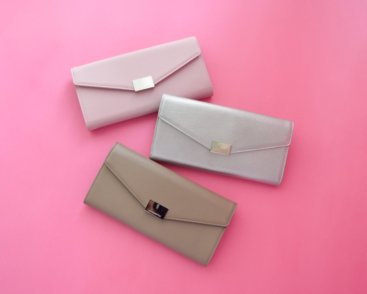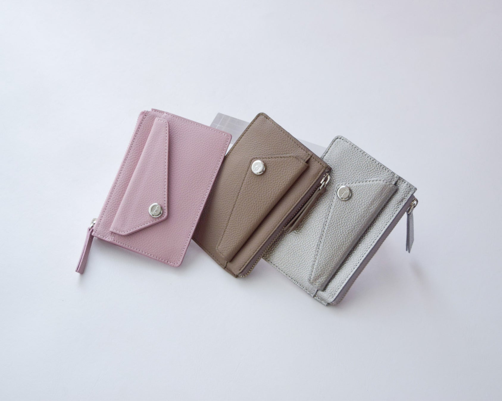 キャッシュレス派の方にオススメの封筒のような見た目がかわいいフラグメントケース。ファスナー付きのフリースペースとカード入れ×4枚、スナップボタン付きのポケットとスマートながら容量も◎。フリースペースは細マチ付きで、お札やコインはもちろん、鍵を入れたり色んな使い方が出来ます。