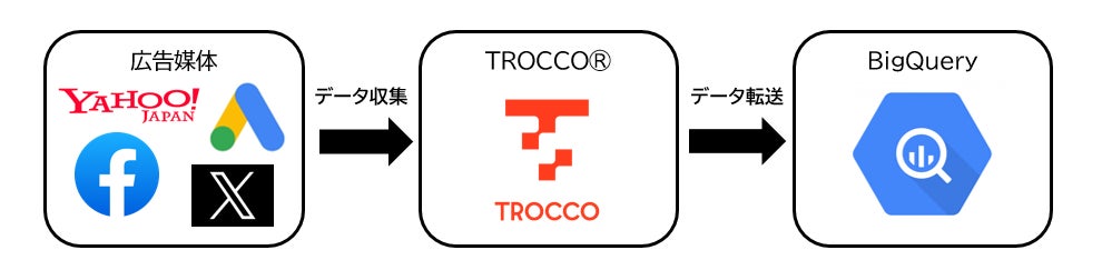 そこで当社は、TROCCOのETL/データ転送を使用し、データ処理の自動化を実現しました。広告媒体のデータをTROCCOで収集し、Google BigQueryに転送、Google Apps Script(GAS)にデータを貼り付け、作成しています。