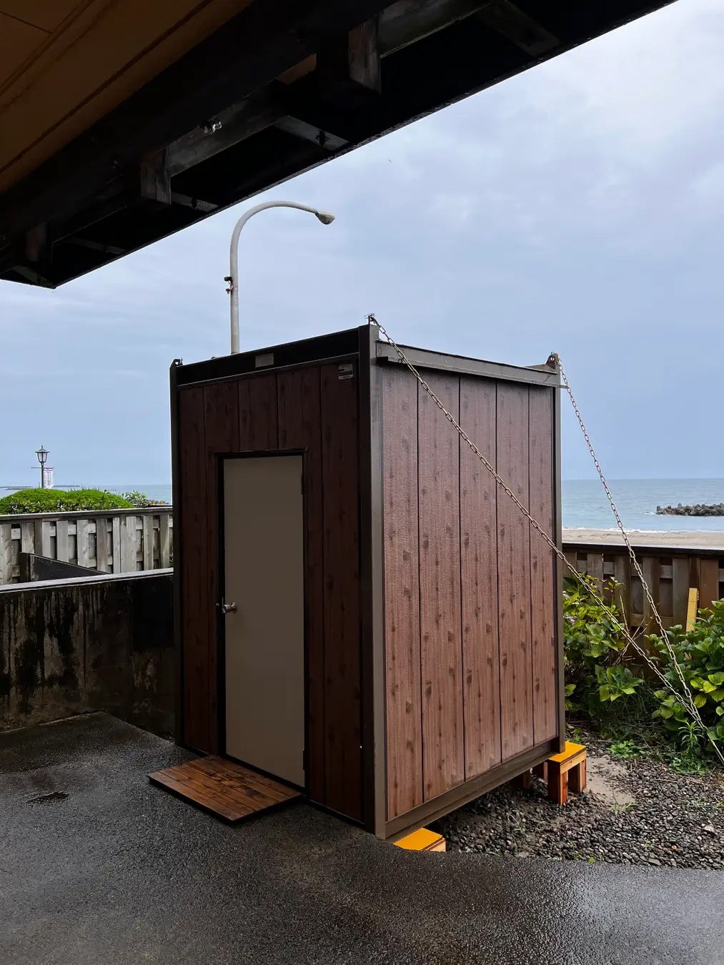 「海辺のお宿一久」では、2023年より敷地内の海へ移動する通り道にコンテナ式更衣室を設置しました。ご宿泊のお客様は、事前申請などは不要で自由にご利用いただけます。ひと目や時間を気にせず、ご家族で安心してお着替えください。