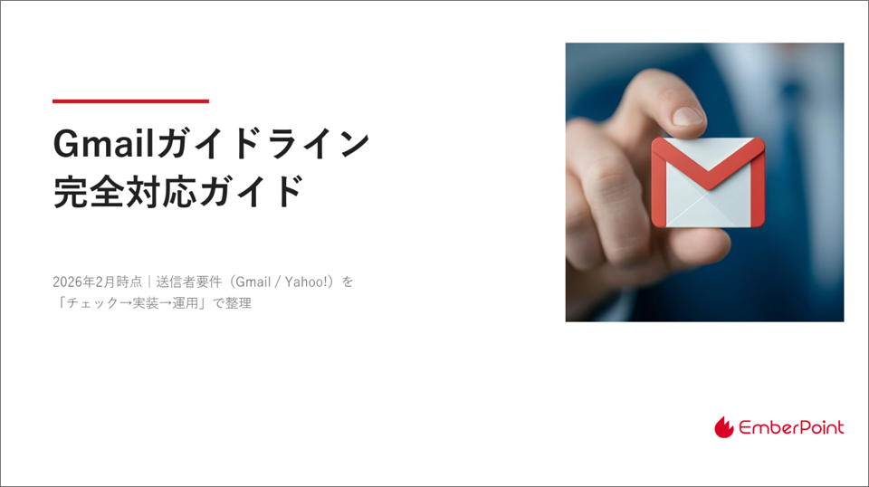 エンバーポイント株式会社(本社:東京都千代田区、代表:五十嵐 真人、以下「エンバーポイント」)は、2026年2月時点の最新情報を反映したホワイトペーパー『Gmailガイドライン 完全対応ガイド』を公開いたしました。本資料は、Gmailが求める送信者要件の「3つの必須要件」を中心に、多くの企業が直面する課題や、継続的な配信品質を維持するための「6つのステップ」を網羅しています。