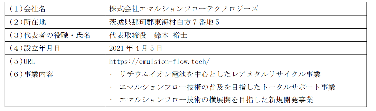 EFT社は、原子力機構が開発した革新的な溶媒抽出技術「エマルションフロー」を活用した事業を展開するスタートアップ企業です。エマルションフローは、従来の溶媒抽出技術と比較して、低コストで効率的に高純度な元素分離を可能にする革新的な技術であり、レアメタルを取り巻く社会課題の解決に寄与できると期待されております。