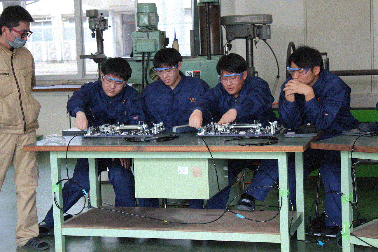 ・普段の実習では学べないことを学ぶことができ、とても良い経験となった。機械保全の仕事といえば、安全のためという抽象的なイメージしか持っていなかったが、今回の実習で、ネジのしめる強さや回路の配線で線をつなぐところなど、少しの違い、間違いが機械の誤作動や大きな事故に繋がってしまうということを知り、とても難しく大変な仕事であることが知れた。今回来てくださった講師の方は、自分が機械を修理し、現場の方にありがとうと言われるところにやりがい楽しさを感じられていたと聞き、素晴らしい仕事であることが分かった。将来の選択肢として視野に入れていきたい。