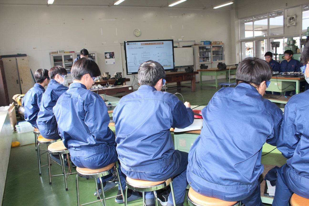 熊本県立玉名工業高等学校機械科1年生の生徒74名に半導体のエンジニア派遣実習を実施。熊本テクノセンターの遠山センター長より、機械のメンテナンスについての説明や空圧回路実習、LED点灯回路の作成、などの実際に当社で使用している器具を使用した実習を行いました。