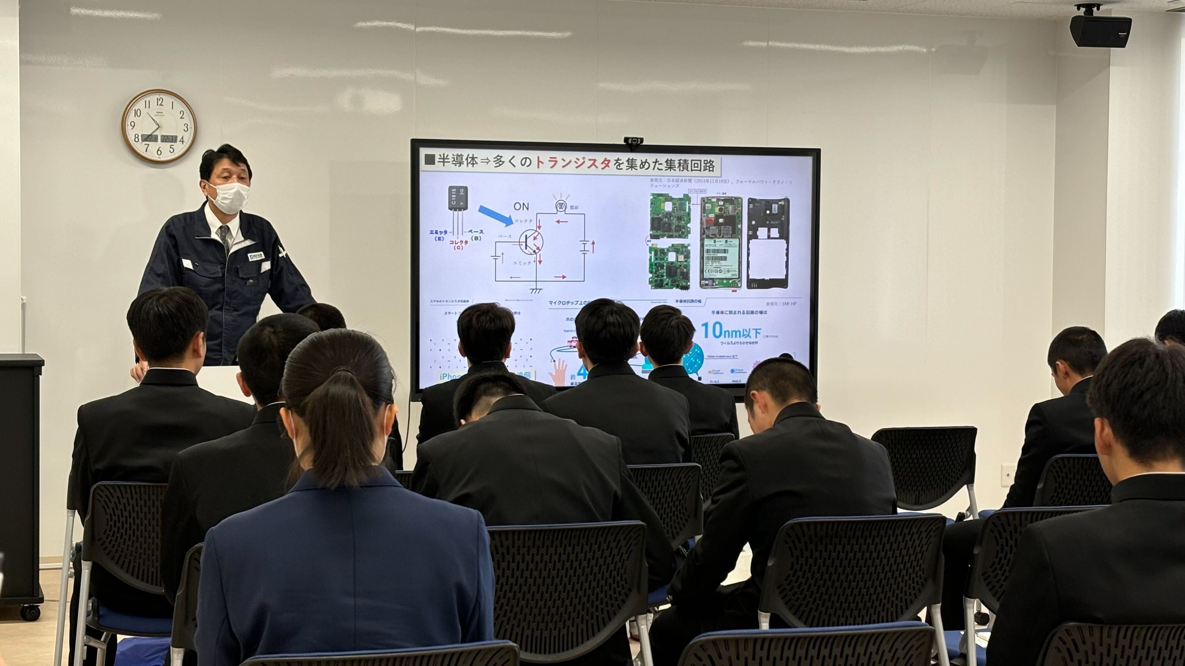 熊本県立八代工業高等学校電気科2年生の生徒52名に半導体実技研修を実施。熊本テクノセンターの遠山センター長より、半導体業界の役割・動向などについて説明。